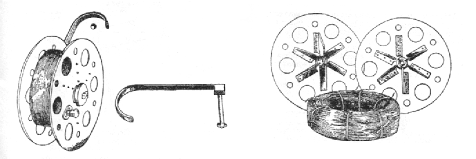 labels, three-part wooden poles, screw fittings for supporting cables,