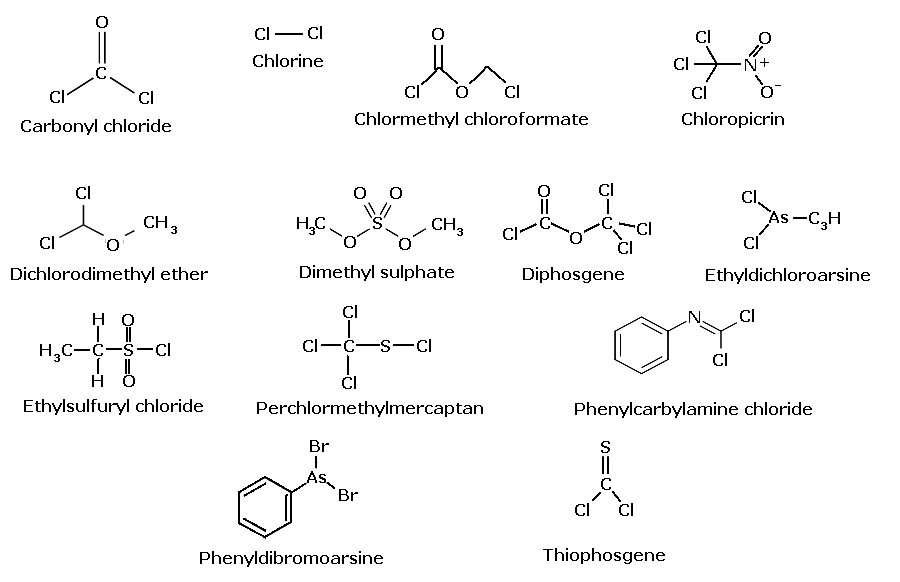One of very few choking agents that are considered likely to be used in warfare today. It is a colourless gas; in low concentrations, its odour resembles freshly cut hay or grass. Poisoning caused by phosgene depends on the amount a person is exposed to, the route of exposure, and the length of time that a person is exposed. Carbonyl chloride gas and liquid are irritants that can damage the skin, eyes, nose, throat, and lungs