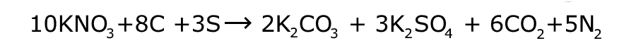 In the right hand column you will see a simplified equation for the detonation of gunpowder. In it you will note that the numbers of each type of atom on the left of the arrow are the same as those on the right. This is a characteristic of a chemical reaction, the atoms are not themselves changed, they are simply re-arranged. The properties of the substances on the left are different to those on the right. On the left there are three solids (at room temperature), on the right they have become two solids and two gases. These gases take up much more volume than the solids, magnified by the fact that they are also at a very much higher temperature.