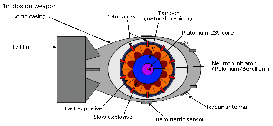 The gun type weapon can only used 235U as 239Pu suffers from a condition known as pre-detonation, in other words it will start a chain reaction prior to becoming fully assembled into the super-critical mass, and produce a far lower level of energy than is required. The pre-detonation is due to the presence of 240Pu contamination. Manhattan Project scientists devised the implosion method of assembly, in which high explosives are arranged to form an imploding shock wave which compresses the fissile material to super-criticality. When the high explosive is detonated, an inwardly directed implosion wave is produced. This wave acts upon the heavy metal tamper which in turn compresses the sphere of fissionable material. The decrease in surface to volume ratio of this compressed mass plus its increased density is then such as to make the mass super-critical. In more recent weapons the fissionable material is usually surrounded by a tamper consisting of 238U. The HE is exploded by detonators timed electronically by a fusing system, which may use altitude sensors or other means of control. The design of the explosive charges and their firing is complex and is was a major issue for the Manhattan Project engineers. Specialised components had to be developed to construct the firing circuitry. The bomb which was used for the Trinity test and for the bomb dropped on Nagasaki. In the centre of the fissile mass is a source of neutrons, usually composed of beryllium and polonium, known as the initiator.