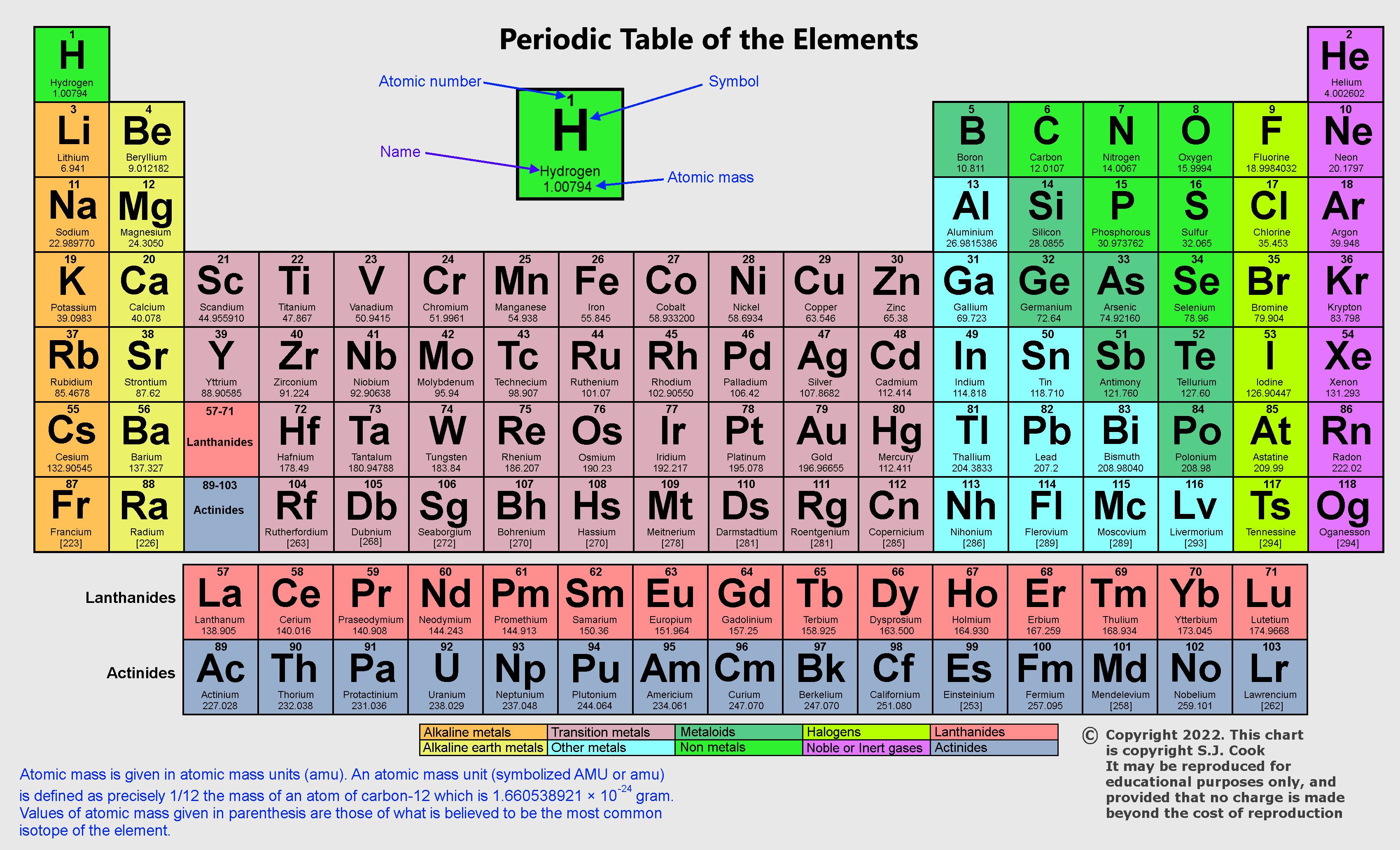 The elements may be listed in order of the number of protons (their atomic number). Elements in a vertical column are said to be in the same group, and have similar chemical properties.