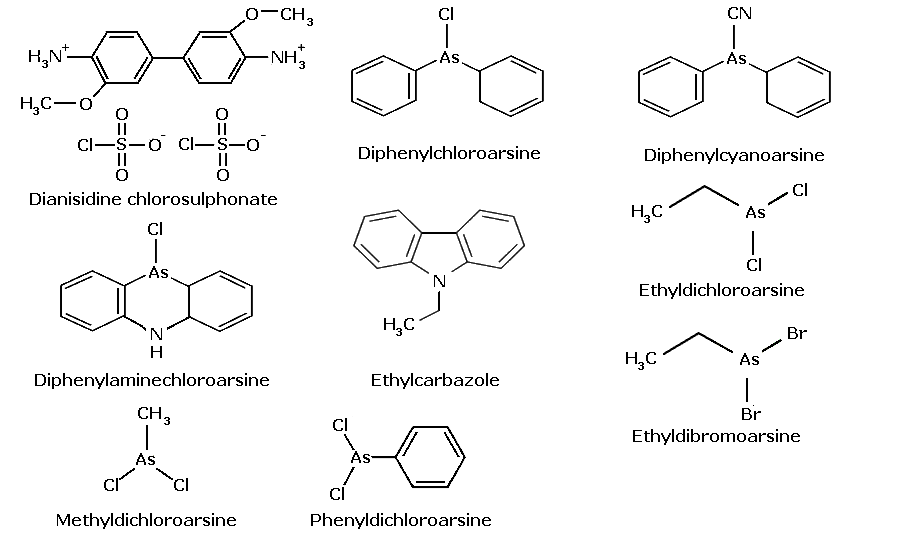 An odourless crystalline compound with a very low vapour pressure. The colour of the crystals ranges from bright yellow to dark green depending on the purity. It is readily soluble in some organic solvents (e.g., acetone, dichloromethane), but nearly insoluble in water. In vapour form it appears as a canary yellow smoke. Usually dispersed as an aerosol, making the upper respiratory tract the primary site of action. Although the effects are similar to those caused by typical riot control agents (e.g. CS), they are slower in onset but longer in duration, often lasting for 12 or more hours. After a latency period of 5-10 minutes irritation of the eyes, lungs and mucous membranes develops followed by headache, nausea and persistent vomiting.