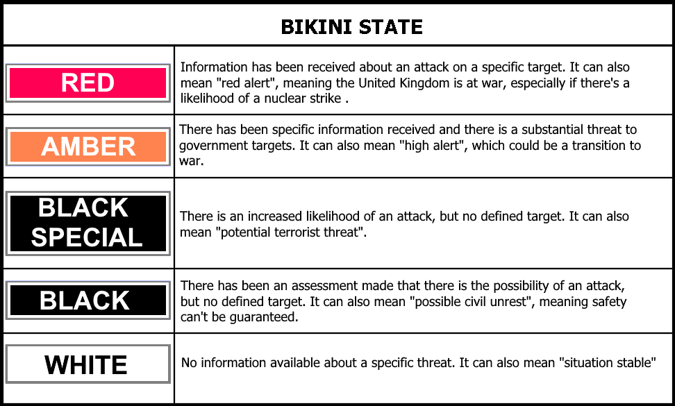| Normal television and radio programmes suspended (or programmes cancelled, changed or interrupted). E.g. weather forecasts are suspended. All broadcasting would come under the Wartime Broadcasting Service. All local and commercial stations suspended. | To warn of attack, give official information and free up labour for war effort. Protect and Survive information films might be broadcast. In the case of weather forecasts this could also be to prevent spies and terrorists getting information on when to attack. | Could be detrimental to morale if a popular show were pulled. Protect & Survive and other public information films could backfire and cause people to switch off official broadcasts. The Government also has powers to take control of the BBC in an emergency under the BBC Charter and the Broadcasting Act 1980. |
